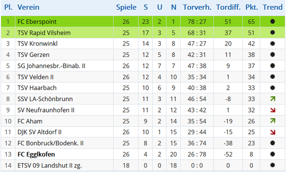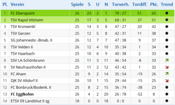 Klare Fronten an der Spitze und am Tabellenende gibt es zur Saison-Halbzeit in der Fußball-A-Klasse Landshut. Am Sonntag behauptete der FC Eberspoint (35 Punkte) mit einem 2:1 Sieg gegen den Dritten Kronwinkl (25) sein Sechs-Punkte-Polster auf Rapid Vilsheim (29), der in Velden mit 2:0 gewann. Auf den Relegationsplatz rutschte JoBi II (4./24) durch eine 1:2 Schlappe in Aham ab. Neufraunhofens Zweite schickte die 09-Reserve beim 10:0 zweistellig nach Hause.