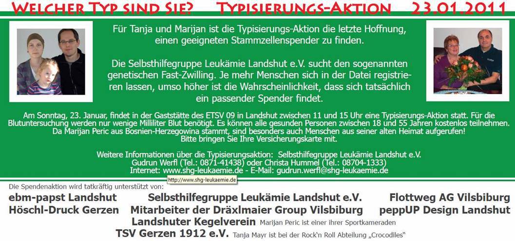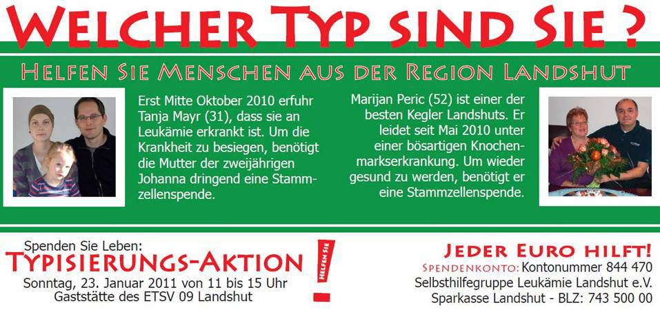 Leider ist die Frau eines langjährigen Mitglieds des FC Egglkofen an Leukämie erkrankt. Aus diesem Grund starteten verschieden Firmen, Vereine und Organsisationen eine Typisierungsaktion um ihr und anderen an Leukämie erkrankten Personen helfen zu können. Daher die Bitte an alle noch nicht Typisierte-Personen: LASST EUCH TYPISIEREN, denn so können Leben gerettet werden!
