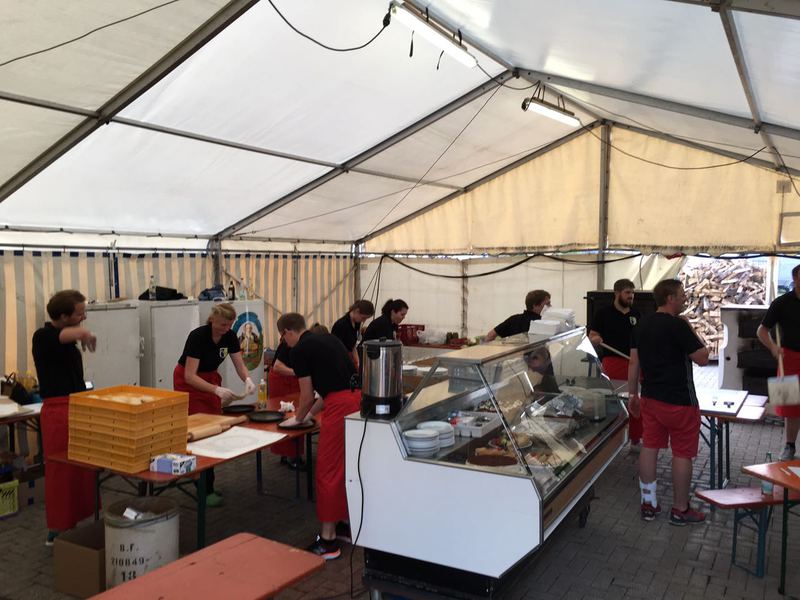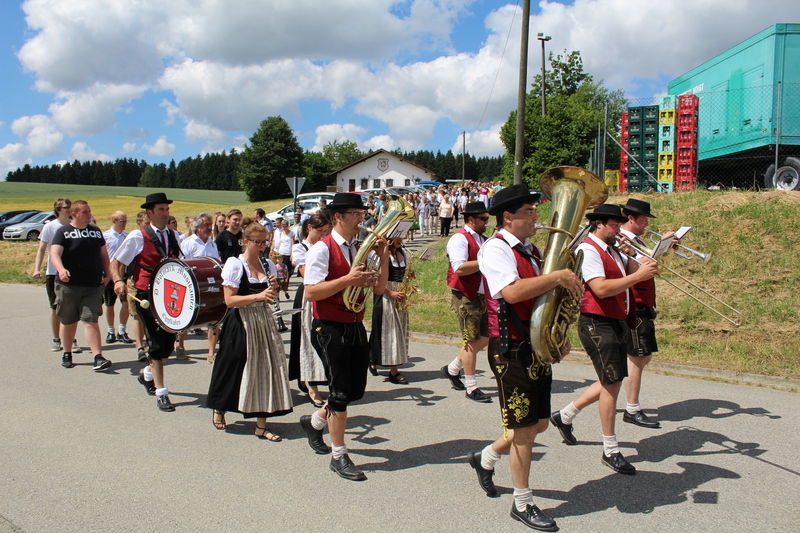 Der Samstag wurde genutzt um alles für den eigentlichen Festakt vorzubereiten. Hierfür wurde zur Zeremonie des Festgottesdienstes extra eine Bühne auf dem Fußballplatz aufgestellt und so platziert, dass die Besucher auf der Tribüne Platz nehmen konnten. Der hiesige Pater Paul zelebrierte den Gottesdienst und konnte sich über regen Besuch freuen. Nach dem Gottesdienst richteten Vorstand Reinhold Weber und Bürgermeister Johann Ziegleder noch ein paar Worte an die Gäste. Sobald der letzte Redner das Pult verlassen hatte, wurde sich zu einem kleinen Festzug ins Zelt aufgestellt. Angeführt durch die Hofmarkmusikanten aus Egglkofen pilgerten die Gäste ins Zelt und wurden sofort mit frischen Getränken versorgt. Für einen kulinarischen Leckerbissen wurde unser alt bewährter Sax Tobi geordert, der mit Bratenspezialitäten den Gästen den Hunger vertrieb.