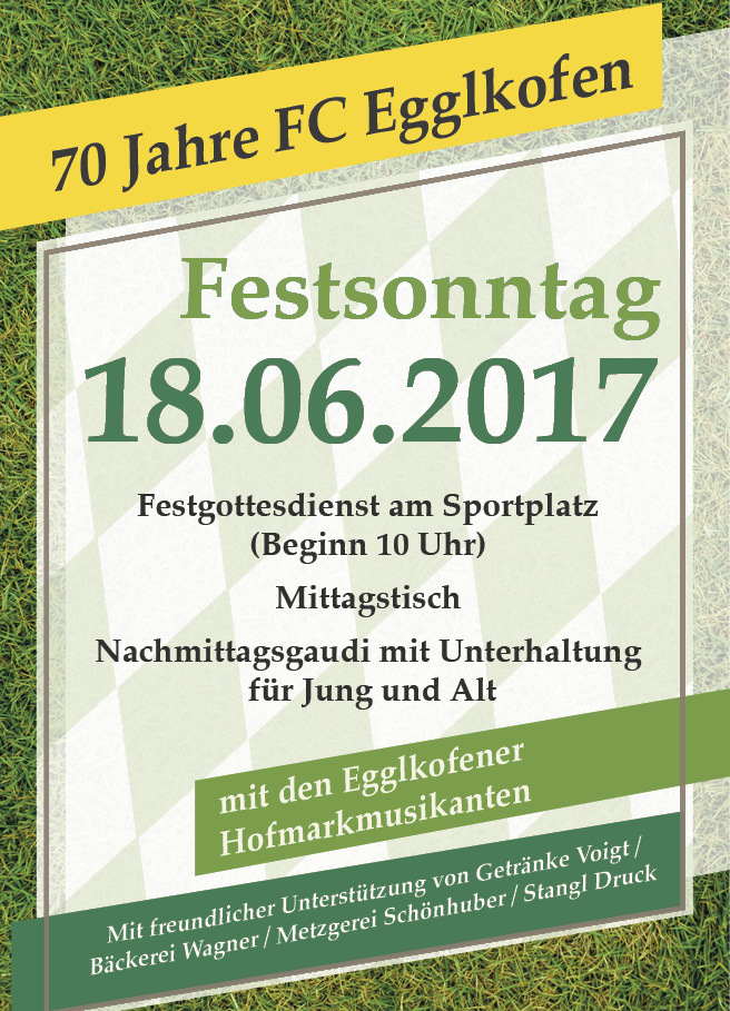Anlässlich des 70 jährigen Jubiläums der Vereinsgründung des FC Egglkofen e.V. feiern wir mit euch dieses besondere Ereignis am Sportplatzgelände des FCE vom 15.06 - 18.06.2017.