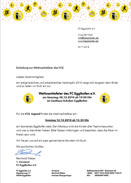 Die Weihnachtsfeier für alle Mitglieder und Förderer fand am Samstag, 08.12.2018 wieder im Gasthaus Schober in Egglkofen statt. Trotz einiger Absagen konnte Vorstand Reinhold Weber zahlreiche FCEler und Ehrenmitglieder im Saal begrüßen. Nach seinem Jahresrückblick und dem gemeinsamen Abendessen wurden die Ereignisse des Jahres noch in gemütlicher Runde bis spät in den Abend hinein besprochen. Ein herzlicher Dank gilt hier Roswitha Schober und Ihrem Team.